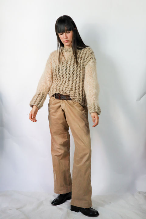 Un pezzo unico, che unisce una lavorazione a mohair con un intarsio in lana intrecciata.